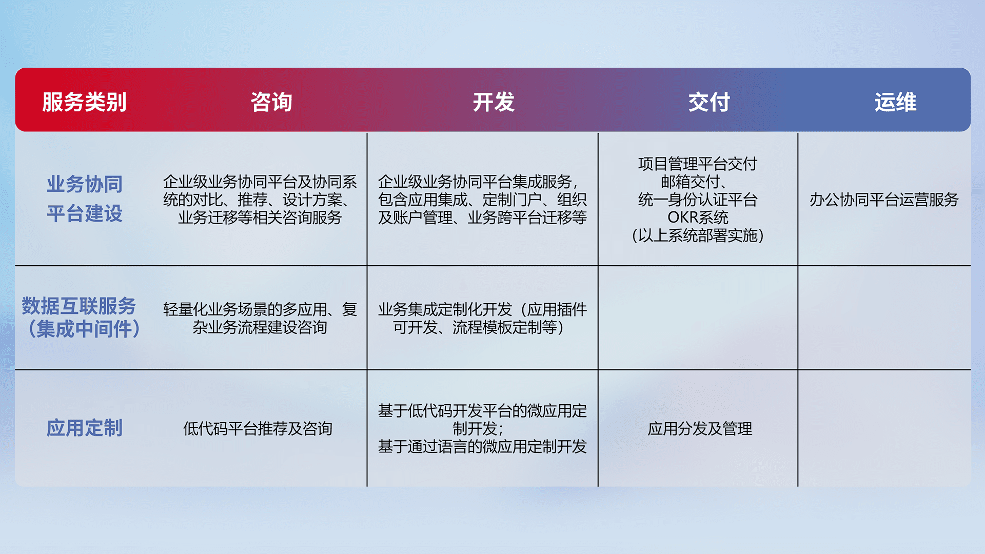 针对钉钉、、企微、、、、IDaas等平台级产品提供产品的规划、、方案、、交付、、、定制化开发等服务,,,实现如统一协同办公、、、智能客户服务、、、、混合会议管理、、、智能数据查询、、、等业务场景,,,,实现数字化转型。。。。