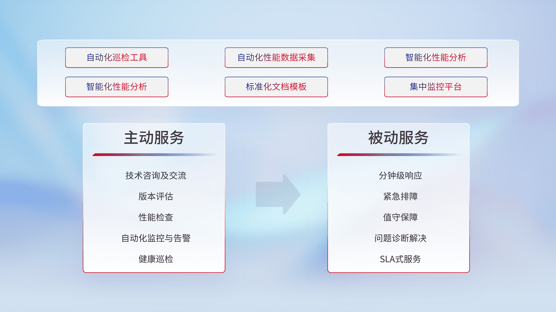 智能化工具和标准化文档,,,,保障服务质量,,,,提供主动服务(包含技术咨询、、版本评估、、、、性能检查、、、、自动化监控与告警、、、健康巡检)和被动服务包含(分钟级响应、、、紧急排障、、值守保障、、问题诊断解决、、、、SLA服务)。。